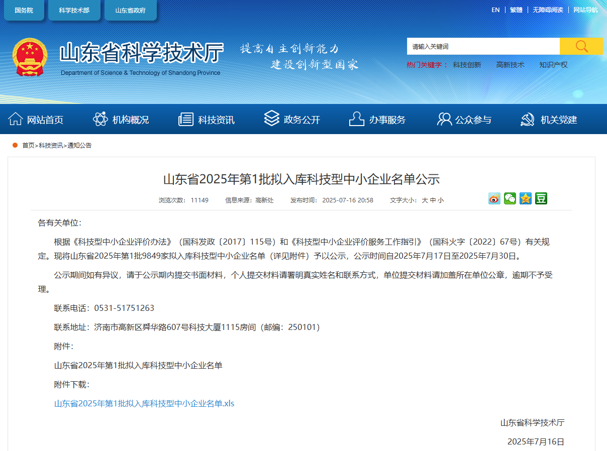 2025年7月16日,山東省科學(xué)技術(shù)廳公示了《山東省2025年第1批擬入庫科技型中小企業(yè)名單》,7月30日公示期結(jié)束后,淄博市碳生態(tài)發(fā)展集團有限公司成功入選山東省2025年度科技型中小企業(yè)名單。這是市碳生態(tài)發(fā)展集團繼2024年首次獲評后,2025年再次獲得這一省級榮譽。